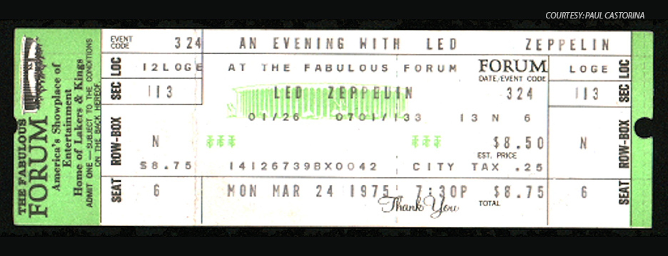 1975, Led Zeppelin performed at the Forum in Inglewood, California. The set list: Rock and Roll, Sick Again, Over the Hills and Far Away, In My Time of Dying, The Song Remains the Same, Rain Song, Kashmir, No Quarter, Trampled Underfoot, Moby Dick, Dazed and Confused (including Woodstock), Stairway to Heaven, Whole Lotta Love (including The Crunge), Black Dog, Heartbreaker.
